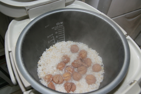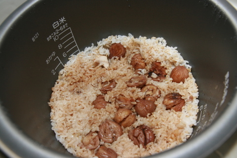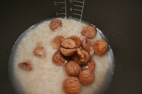◎米洗淨放入平時煮乾飯的水量(可以再少一點點約5%~10%),放入二小匙塩,再將處理好的栗子放入電子鍋,按下一般白飯開關。