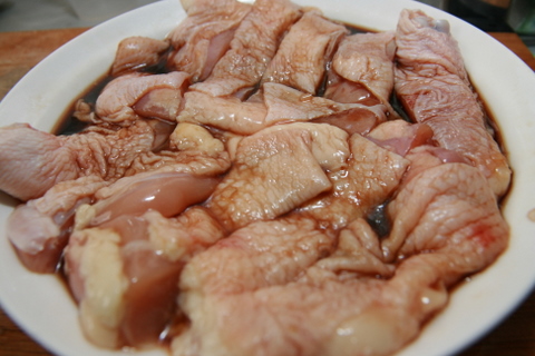 ◎去骨清雞腿洗淨切條塊,以醬油,米酒,糖醃著,放在一旁待用