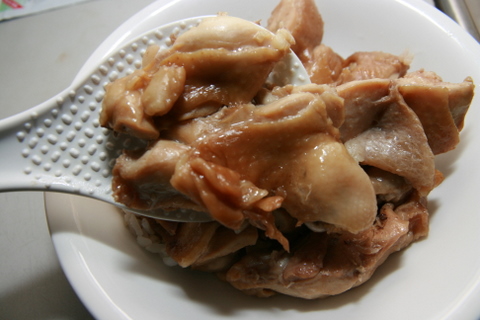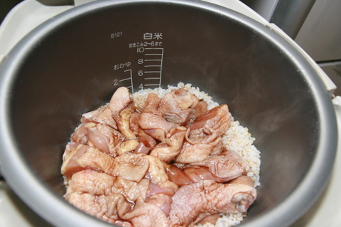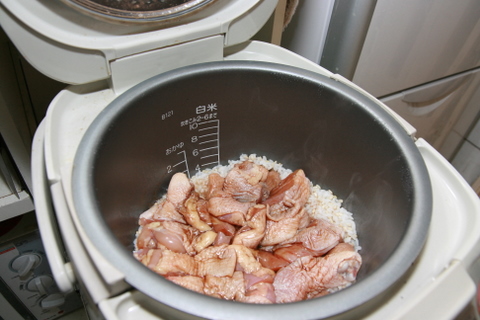 盤裏剩下一點點的醃肉汁,一起倒了進去。醬汁只剩一點點所以一起倒,總量大約不到二湯匙,怕倒太多變成煮粥。雞肉很容易熟,只要大約十五分鐘的時間就會熟透,把雞肉放在飯上就可以馬上蓋起電子鍋鍋蓋續煮。