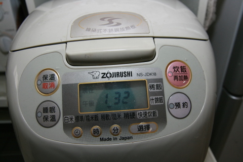一冒出蒸汽就打開鍋蓋,裏頭的狀況是像這個樣子,電子鍋的運作並沒有停止,持續煮著: