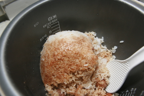◎用飯瓢將栗子和飯拌勻,下頭有些像鍋巴的顏色,醃肉的醬汁己經和飯形成美味的組合
