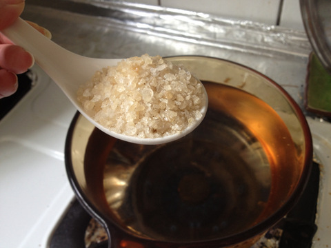 煮綠豆的同時準備糖水,約是綠豆十倍水量,我放了白瓷中型湯瓢的兩大匙冰糖。