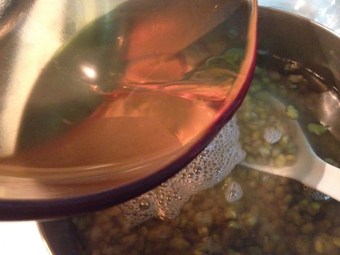 忘了拍熟綠豆的模樣,最上層的豆還會有點硬,但有熟了,先加入糖水。