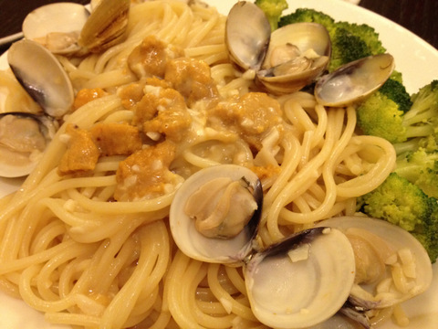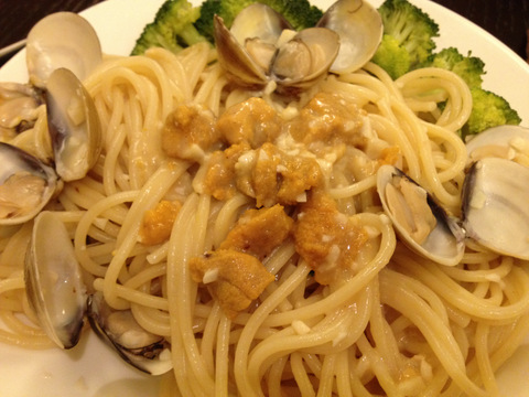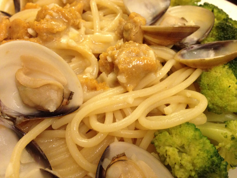其實今天還奢華地在起鍋前加上了切碎的海膽拌炒一下,滋味更豐富,沒有加海膽也沒關係,單純的白酒蛤蜊麵就非常美味了。