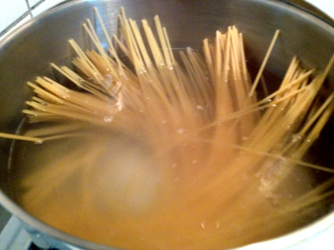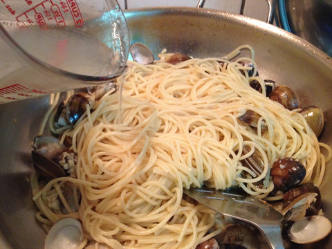 蛤蜊打開第一枚時,加入煮好的義大利麵
