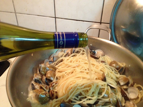 材料:蛤蜊一斤、蒜末1/3碗、義大利麵一包、白酒少許、塩少許