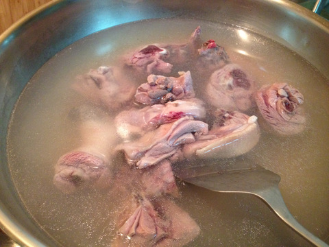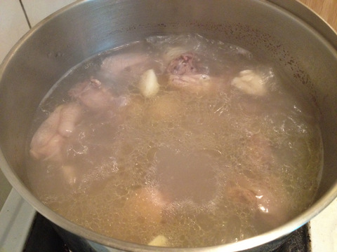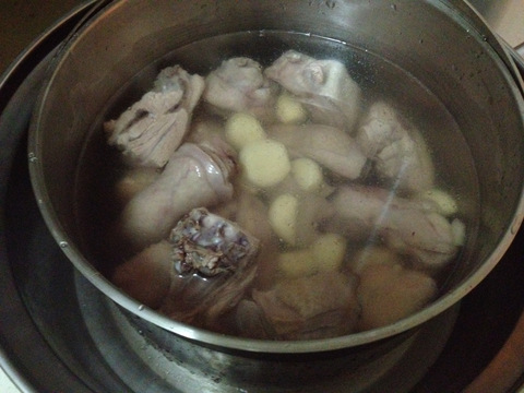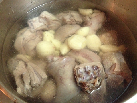 ◎將川燙好的雞肉和蒜頭放入鍋中,加入清水蓋過材料約2~3cm高。