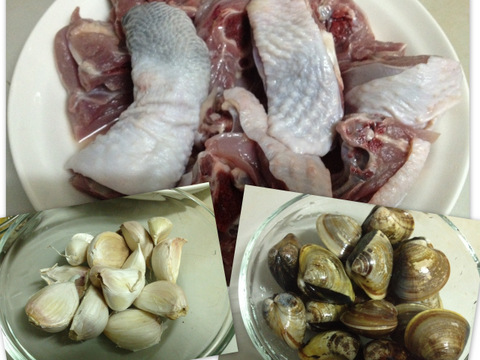 材料:大土雞腿一隻、蒜頭適量、蛤蜊半台斤
