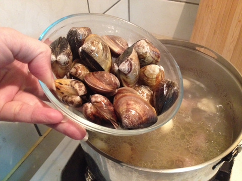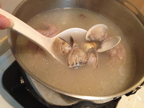 ◎湯滾時加入蛤蜊煮至全都打開即可,不能煮太久,肉會全都掉下來。