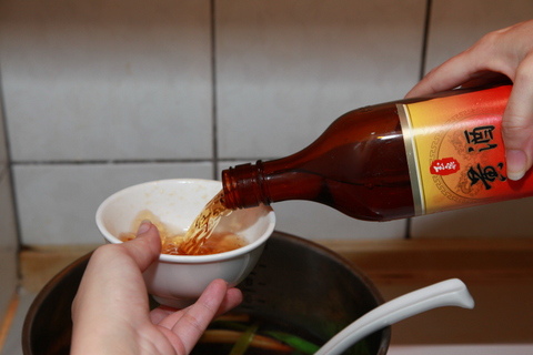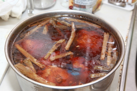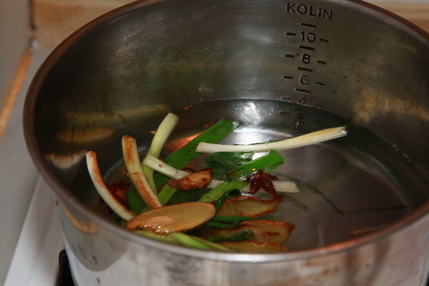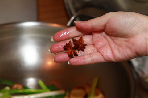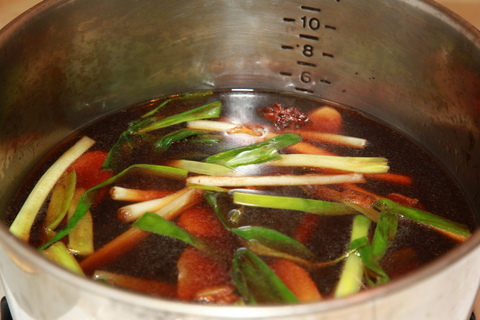 將炒好的香料放入小半鍋水中,準備滷汁。