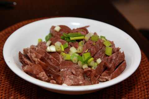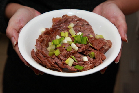 對半切開後再切片,淋上少許加熱的滷汁和葱花,滷牛腱好囉。