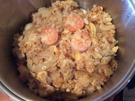 早上六點鐘鬧鐘響,切了半顆架上的洋葱,打個蛋,從冰箱拿出預先退冰的蝦仁,再加上昨夜的剩飯...